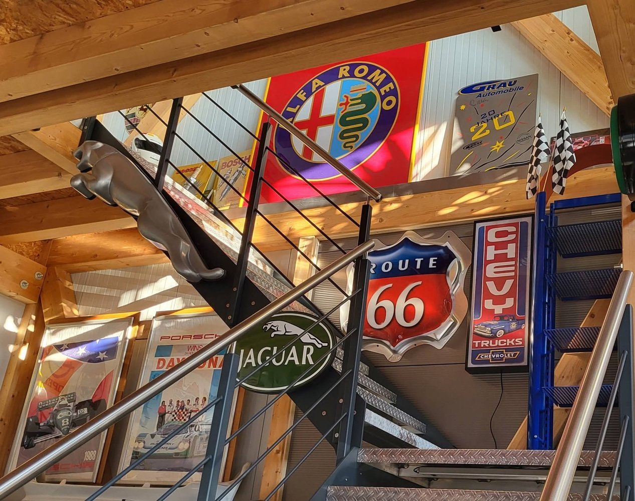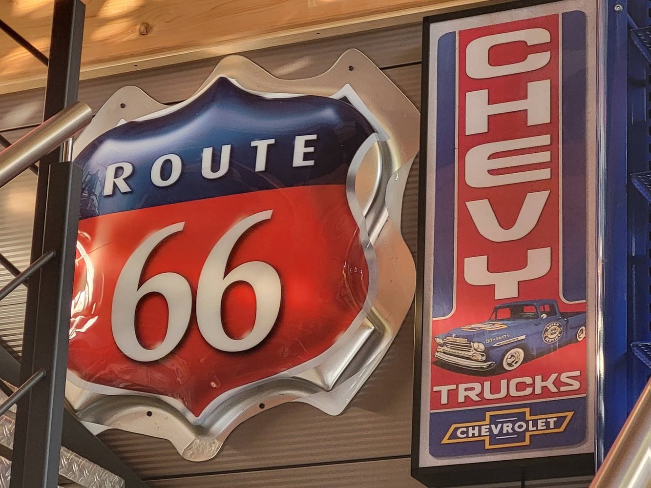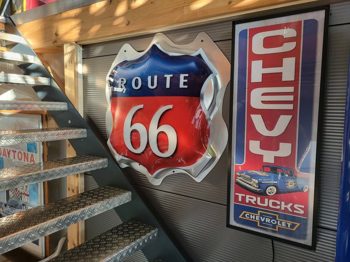 Route 66-Schild im Aufgang zum oberen Büro aufgehängt. Der Außenbereich hat auch ein neues Schild bekommen.